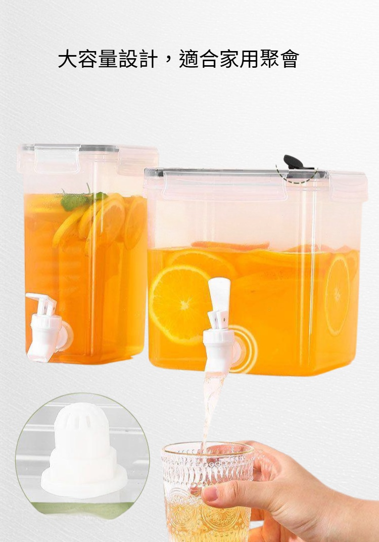 大容量設計,適合家庭聚會使用。耐高溫塑膠材質,安全無異味。附水龍頭,方便取用果汁飲品,清洗容易,適用多種場合。